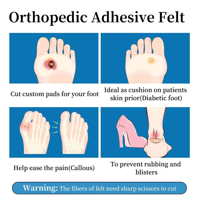 Wide Application: This adhesive felt roll suitable for use as padding under casts, orthopedic braces and splints. Moreover providing support or protection of symptomatic areas, such as neuroma foot pads, metatarsal pad, arch supports, dancers pads, ischemic wound protection