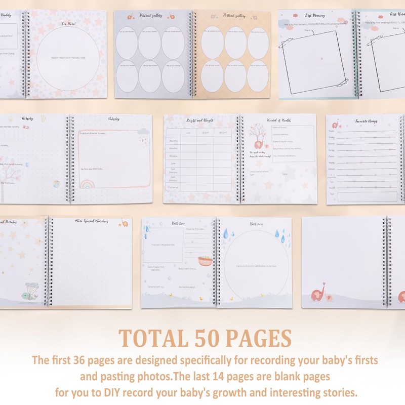 This baby keepsake journal has a total of 50 pages (36 pages of guided milestone pages + 14 blank pages), providing you with ample space to place photos, stories, and sweet memories.