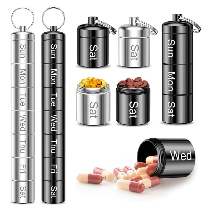 - that they break or be crushed. So this pill dispenser with keychain is perfect for outdoor travel, camping and exploring. AIRTIGHT & WATERPROOF PILL HOLDER KEYRING - With sealing rings on each compartment, our weekly pill organizer provides an excellent airtight storage environment for your pills.