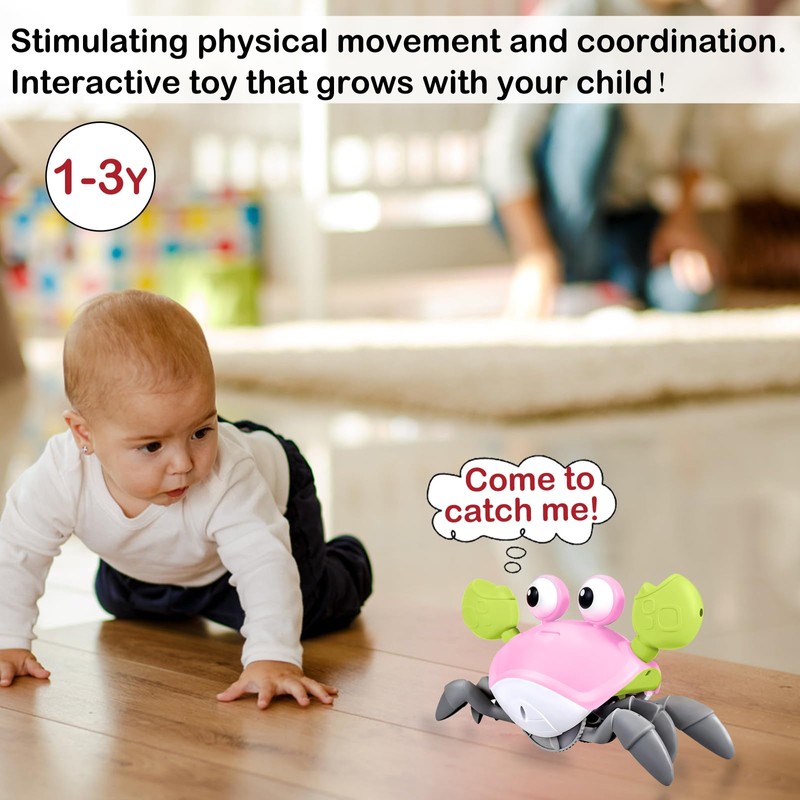 - ❤ Crab Toys for Babies ❤ The walking crab baby toy will start to crawl with the happy songs, when it encounters an obstacle while moving, it will move in the opposite direction, babies like to chase or crawl after it. It also can encourage babies to sit up or remain in a sitting position for a long time to play with and explore.