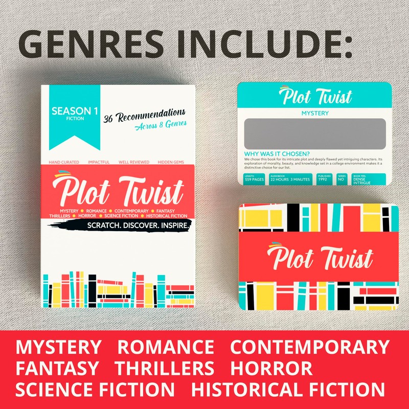 - DISCOVER TOGETHER: One of our favorite ways to use Plot Twist is with a group. Everyone can browse the cards and together agree on something to read together. Works great as couples, families, friends, book clubs, or even a community reading group. Of course it works individually as well! We wanted to create something you could wrap up and be proud to give, even if you don't know the entire history of what your friend or family member has already read. Be aware that Plot Twist provides book recommendations, It doesn't include a copy of the book themselves.