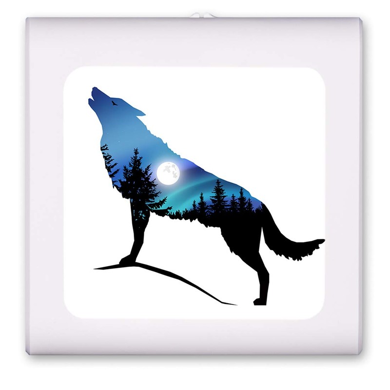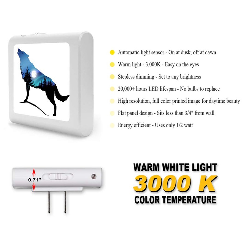 - ADJUSTABLE BRIGHTNESS - Our LED night light features a stepless adjustment slider to adjust the brightness from 0 LM to 15 LM. You’re able to set your desired brightness for different occasions to provide the best lighting experience. Beautifully printed Wolf Silhouette image.