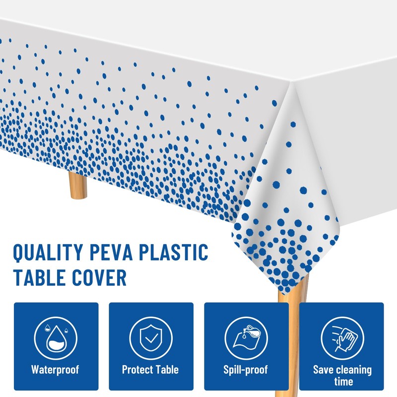 - Material: Our blue table runner is made of polyester material which is soft reusable. The white and blue dot tablecloths are made of PEVA plastic so the product is thinner and may be a little transparent please buy according to your needs. The plastic tablecloth is waterproof oilproof and dustproof it can effectively protect your table it is easy to help you clean up the messy tabletop after the party you can wipe it or roll it up and throw it away. Plastic tablecloths make cleaning super easy
