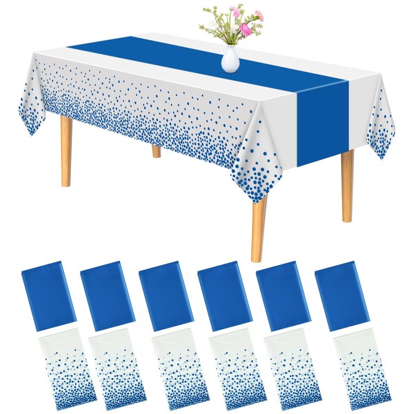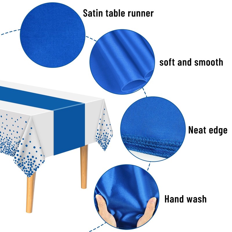 - Package Included: 6 x white and blue polka dot rectangle tablecloths and 6 x blue satin table runners. The white tablecloth with blue confetti dots on the edges, it looks very beautiful and vivid, adding a festive atmosphere to your party