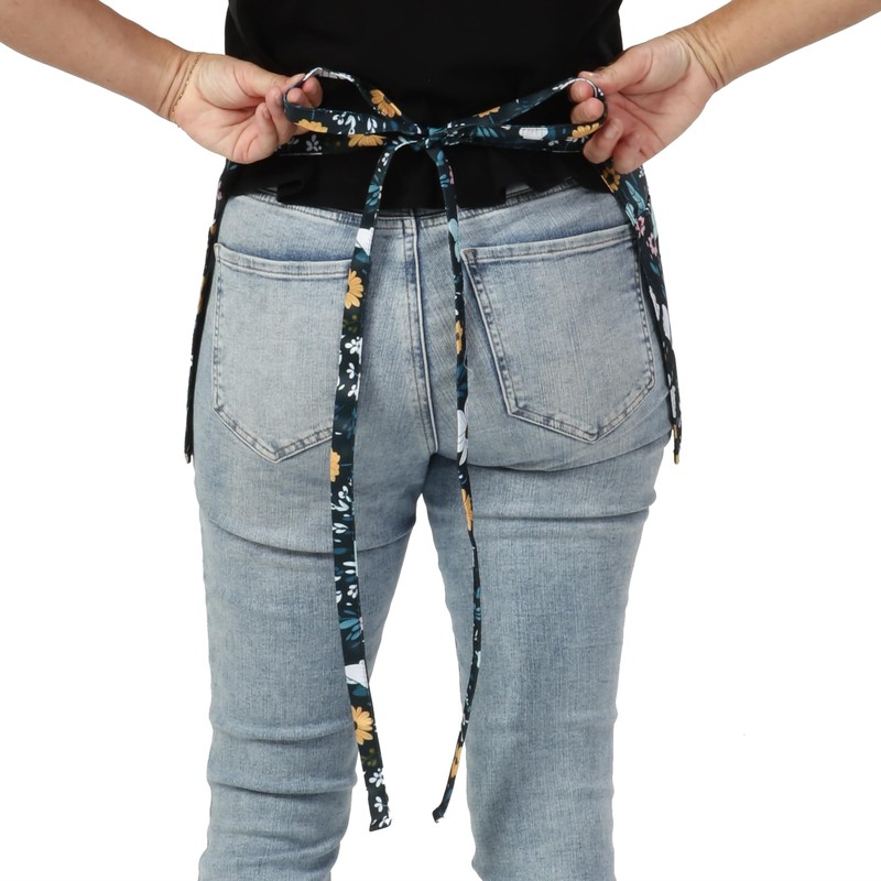Our floral 3-pocket waist apron is the perfect way to add a little sunshine and vacay to your outfit. Beautiful floral design with flowers adorn these server aprons. Double stitching along pockets ensures that pockets stay put to hold your server book, extra packets of sugar or sauce, pens, pads, and cell phone.