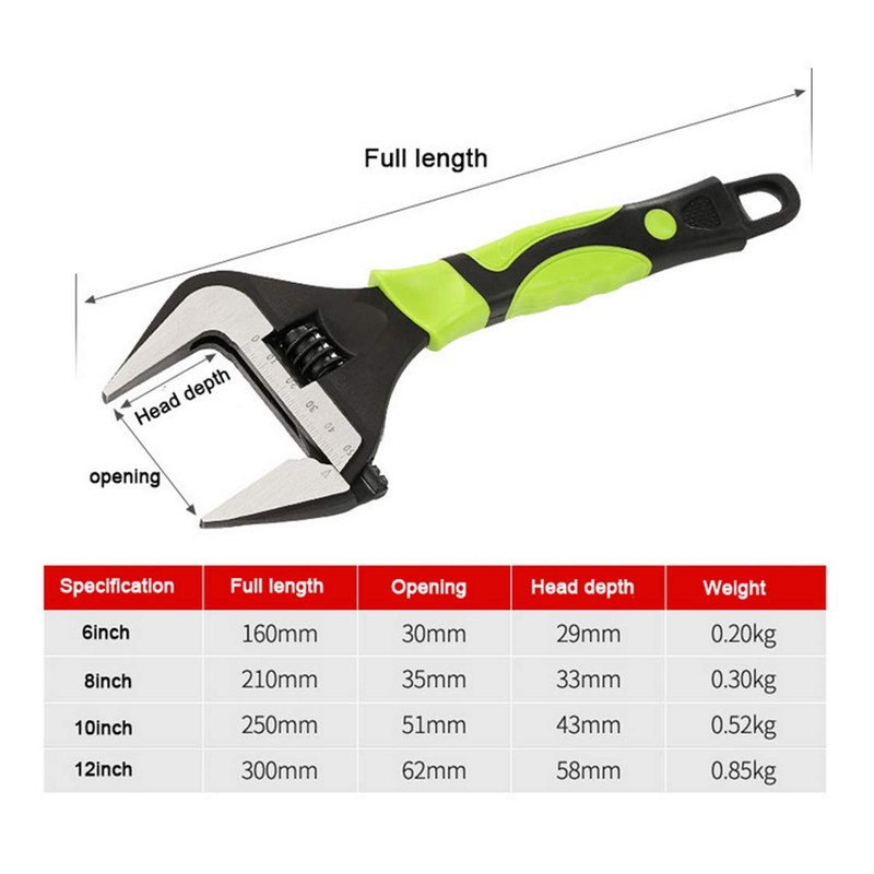 - 1.This Plumbing Adjustable Wrench 4 Available Size Options 6-inch, 8-inch, 10-inch, 12-inch Comfortable rubber grips are designed for durability and comfort. Wider handle provides more comfort and less stress to the hand.