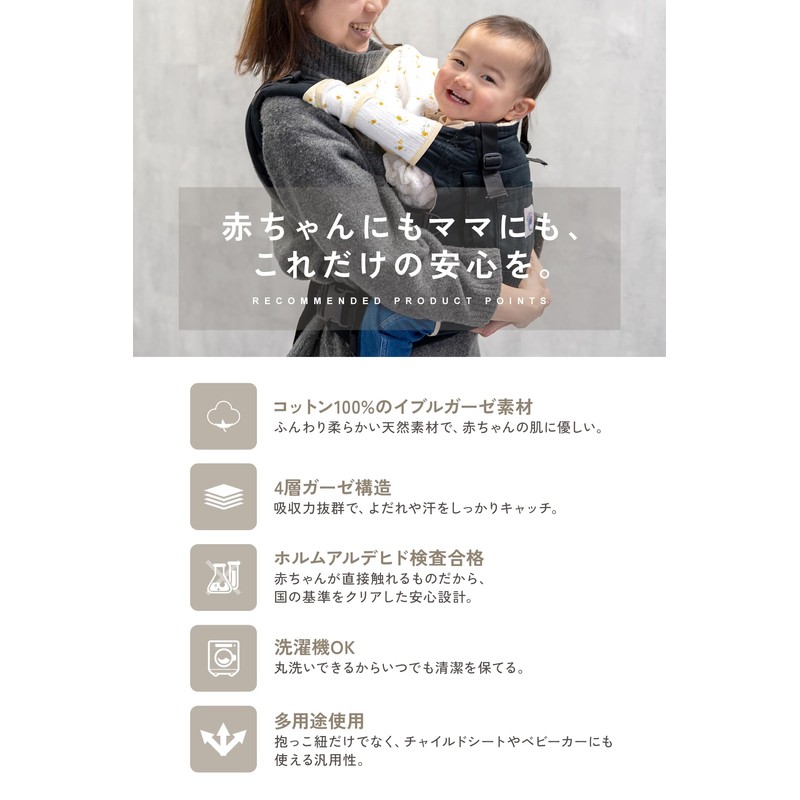 - Gentle Material for Baby: "This product is a product that touches the baby's skin, so we want to choose with confidence. In order to respond to those moms and dads, our products use **100% Cotton** material. Soft and fluffy 4-layer gauze construction is perfect for baby's delicate skin. It is also highly absorbent and will trap sweat and moisture well. In addition, it has passed formaldehyde inspection and is safe to protect your precious baby