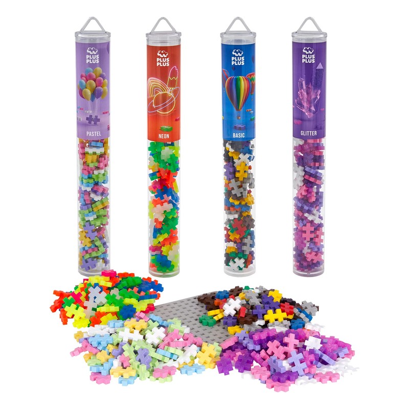 - This Plus-Plus bundle contains 4 different tubes each with 100 creative building blocks and a matching building plate. Included are the four plus plus sets: Basic, Neon, Pastel and Glitter. With a total of 400 pieces in exciting colours and the enclosed pegboard, creative construction projects can be realized freely.