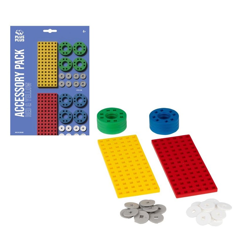 - With the Plus-Plus 30-piece accessory set, children learn how to build cool vehicles and creative play scenes with the help of pegboards and wheels. The colourful plates in red and yellow offer a great addition to Plus Plus bricks. Included are two pegboards and 8 sets of wheels in black and grey.