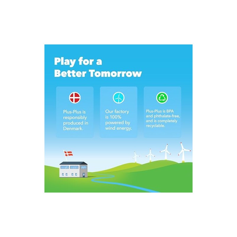 - SUGGESTED FOR AGES 7 & UP: Each Plus-Plus piece measures 3/4" x 1/2". Appeals to a broad range of ages! Made from high quality BPA-free and phthalate-free plastic. Made in Denmark in our own zero-plastic-waste factory powered by renewable energy.