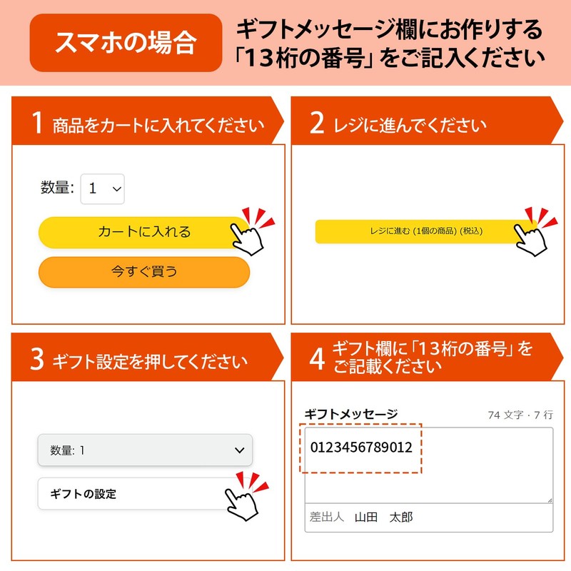 • When you place an order, please press the gift settings and include "13 digit number" in the gift field. (As the picture shows)