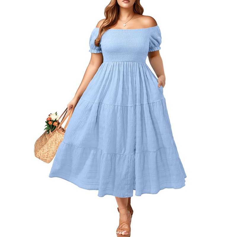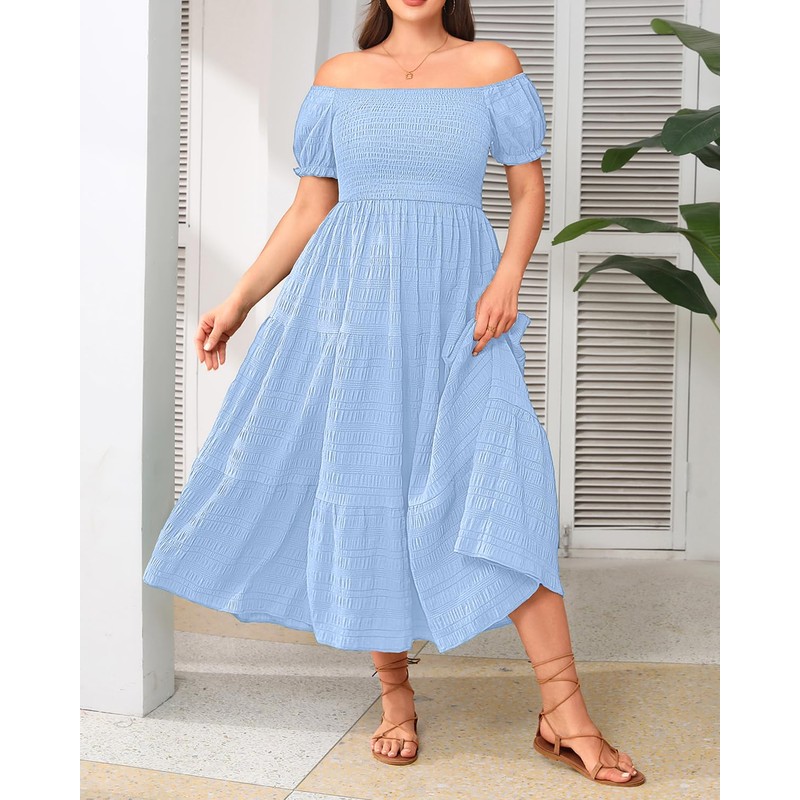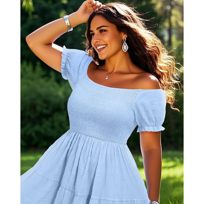 - 【Design】Figure-flattering off-shoulder design enhances curves. Elastic shirred bodice offers adjustable fit. High-waisted A-line skirt smoothes silhouette with discreet tummy control. Feminine puff sleeves & practical pockets.