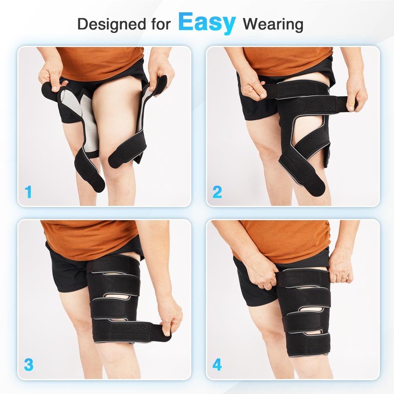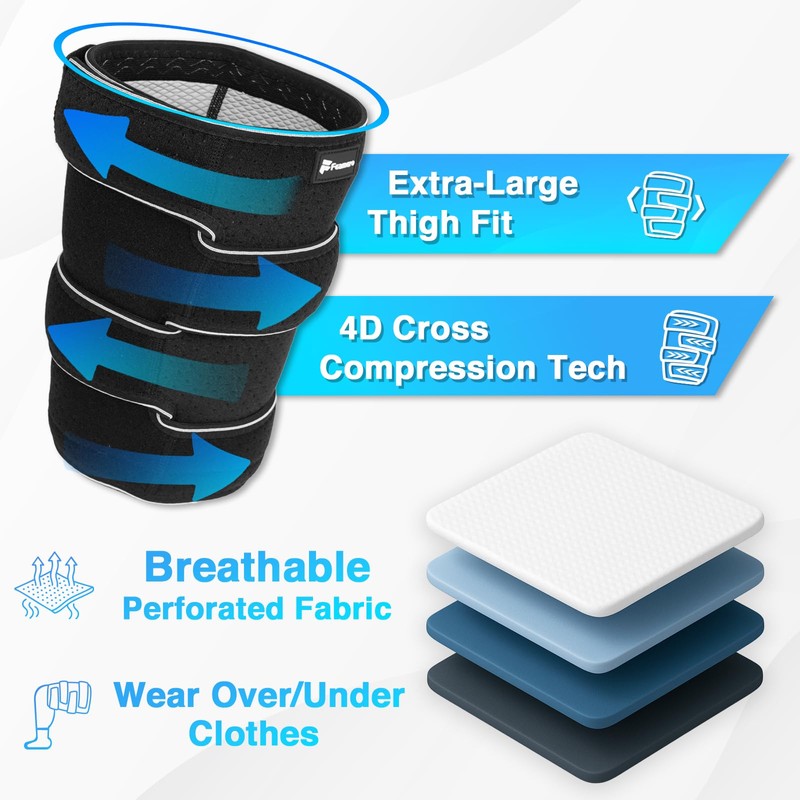 - Breathable, Adjustable, and All-Day Wearable: Crafted with perforated, skin-friendly fabric for 360° airflow and moisture control. Dual hook-and-loop closures allow quick adjustments without removing the wrap. Customize compression levels for active use or rest. The open-ended design is ideal for extended wear and adapts to daily changes in thigh size.