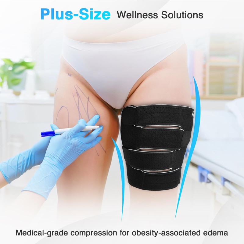 - Plus-Size Wellness Support for Thighs (Up to 43”): Specifically designed for plus-size users, our thigh compression wraps accommodate thigh circumferences from 25” to 43”. Ideal for individuals with edema, lymphedema, or muscle swelling, the widened non-slip design ensures no rolling or digging. Engineered to support Stage II–III lymphedema, post-surgical recovery, and chronic venous insufficiency.