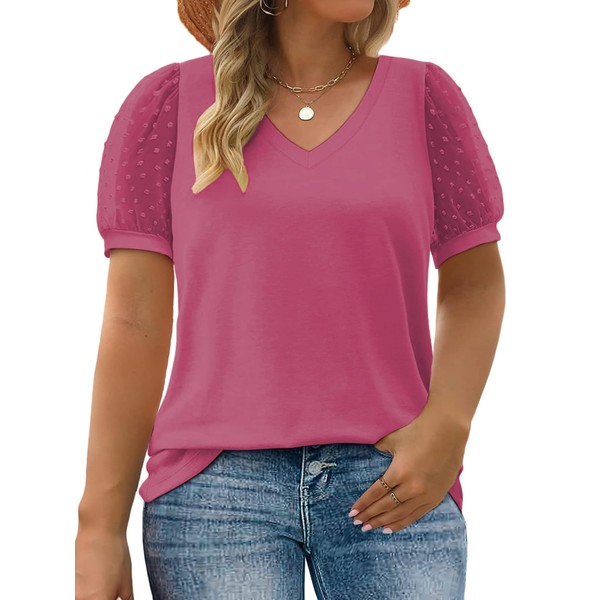 Plus Size Workout Tops 2025 Summer Sexy v Neck Puffy Short Sleeve Cute Swiss Dotted Shirts Rose red XL