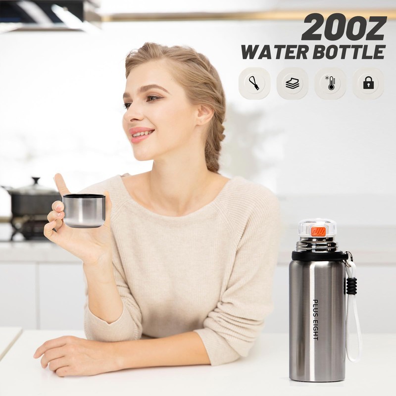 pluseight Stainless Steel Drinking Bottle, 600 ml, Leak-Proof Stainless Steel Bottle with Straw and Lid for School, Children, Women, Men, Leak-proof and Sweatproof with Anti-Dust Lid (Silver)