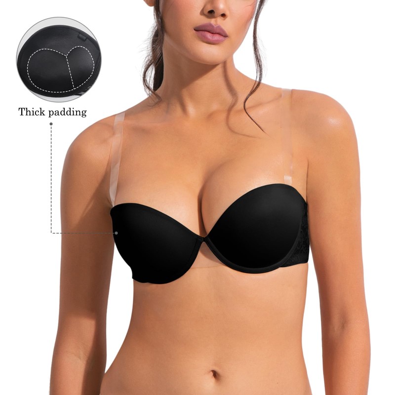 Plusfreeee Strapless Bra,Clear Bra Straps,Push Up Bras for Women,Double Padded Bra Strapless,Underwire Support Black