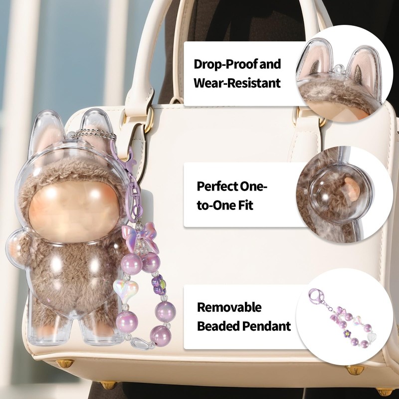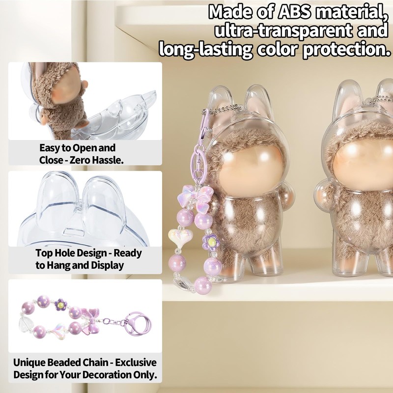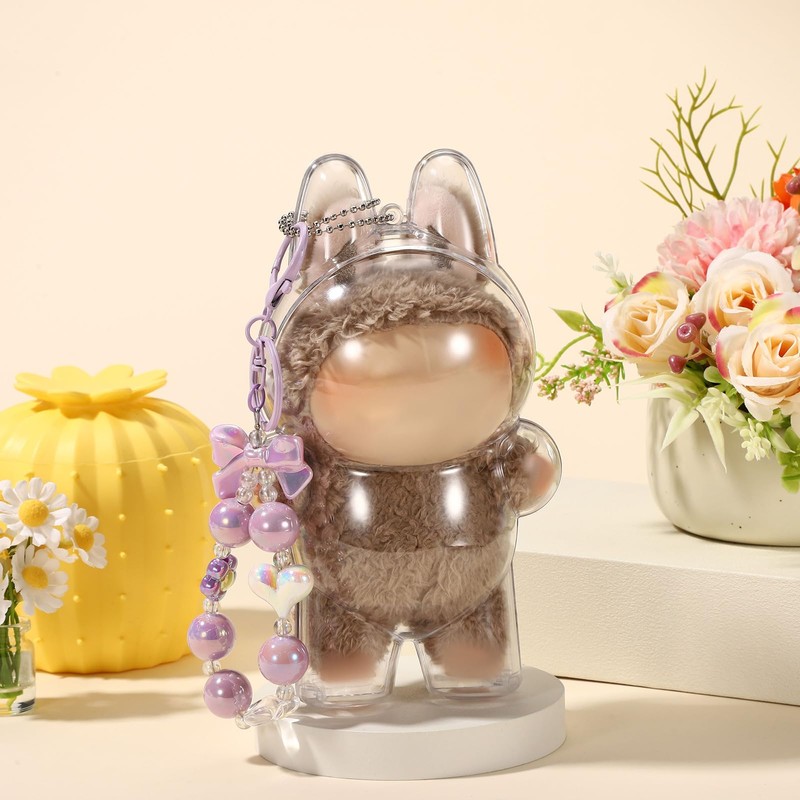 Plush Doll Display Case Keychain, Plastic Transparent Protector Box Cover Doll Clear Protective Bag Accessories with Purple Beaded Lanyard and Key Chain for Carrying 17cm Standing Figure On-The-Go
