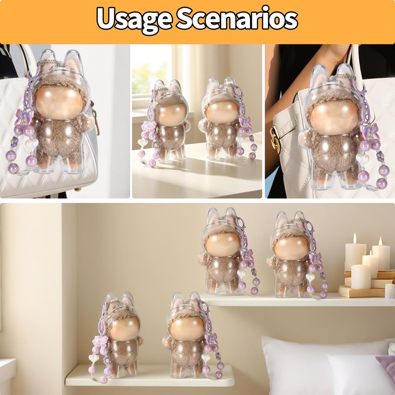 - Package Content: You will get 1 piece of plush doll display keychain case, composing of 1 piece of transparent plush doll protective case, 1 piece of purple sweet lanyard and 1 piece of thin silver chain.