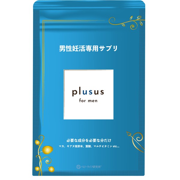 男性妊活サプリ「マイシードー亜鉛配合-for Men」のベビーライフ研究所から、男性もしっかりと葉酸を補いたいというお客様のご要望にお答えしました! 男性用妊活葉酸サプリ「plusus(プラサス)for men」は、厚労省推奨のモノグルタミン葉酸240μg配合。マカ2.0mg配合:ビタミン、ミネラル、アミノ酸がバランスよく含まれており、男性の滋養などの目的で用いられています。キヌア発芽米、ローヤルゼリー、高麗人参、野草発酵エキスなど男性本来の健康をサポートする成分を配合しました。 複数の医師と薬剤師のダブル監修・医薬品等製造及び管理の基準GMP認定工場で製造・管理。残留農薬検査、放射能検査実施済。 香料・着色料・保存料・香料発色剤・漂白剤・防カビ剤・膨張剤・苦味量・光沢剤不使用。 1袋60粒入り。1日2粒をお召し上がりいただくことをお勧めしております。