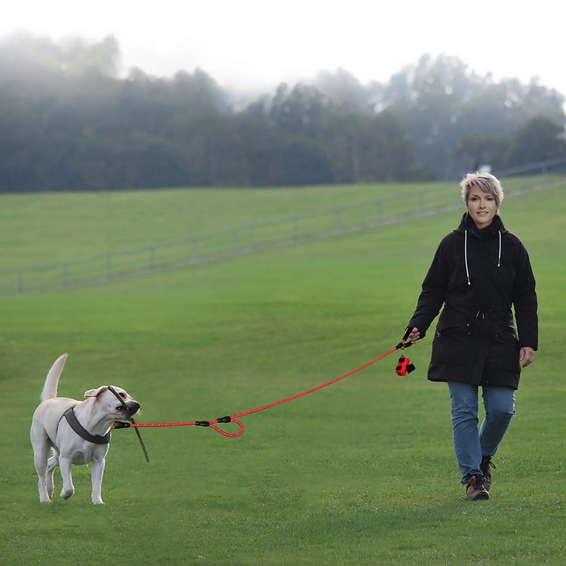Our rope dog leash features 2 handles, one at the end of the leash at 6 feet and another at 2 feet from the clip. The long one is perfect for casual walks, extended sniffing, and loose leash walking, the shorter one is great for busy sidewalks, bike paths, and crowded areas that require that you have instant, up-close control of your dog. Can be used as a Training aid to control Dominance and Aggression.