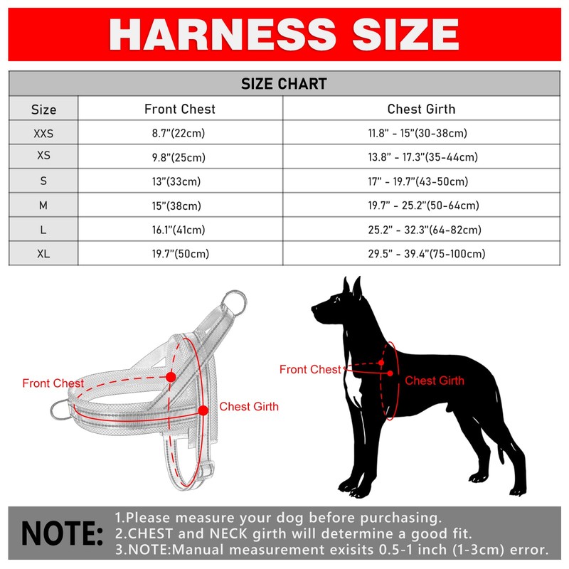 • 【Easy on and off】Quick fit/Step-in design. The easy dog harness has only 1 buckle to control the adjustment, very easy to put on and take off. 【Kindly note】Please carefully measure your dog size under our size chart. We provide replacement or full refund if the size doesn't fit your dog.