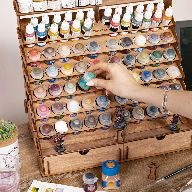 - Perfect solution for your comfort C This awesome army painter paint rack organizer puts together all of your paints and other art stuff. Just imagine, with Plydolex wooden craft paint storage rack you will find the desired paint as quickly as possible. Also, the paint supply storage organizer has 2 cabins, which are convenient for storing more paints and other DIY tools and items. Universal size holes are ideal so it is easy to put and remove paints and brushes from the Vallejo paint holder.