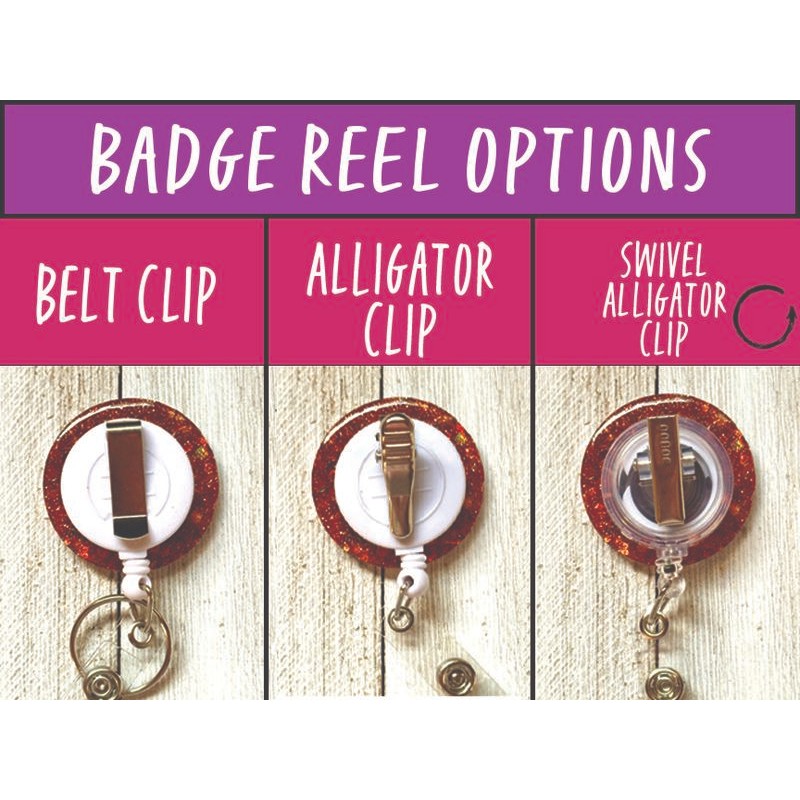 Choose between a convenient belt clip or a alligator clip to suit your preference and keep your badge securely in place. The alligator clip may be a swivel badge reel or a stationary alligator clip (as shown). The resin disk is glued directly to the badge reel using E6000 glue to keep it extra secure! Please note that badge reel internal mechanisms do go bad.