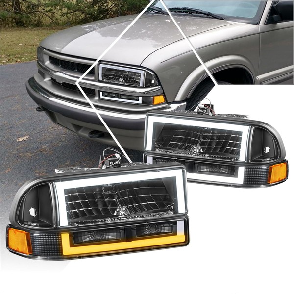 PM PERFORMOTOR Switchback Dual LED Box Style Headlights+Bumper Lights Compatible with 98-04 Chevy Blazer S10,Black Housing Amber Corner