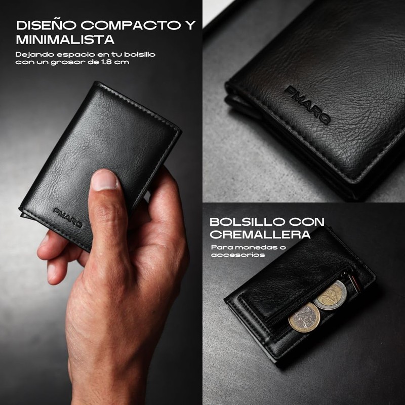 • DESIGN This elegant wallet is made of leather and aluminum in a compact and minimalist design. Ideal as a gift with its premium box.