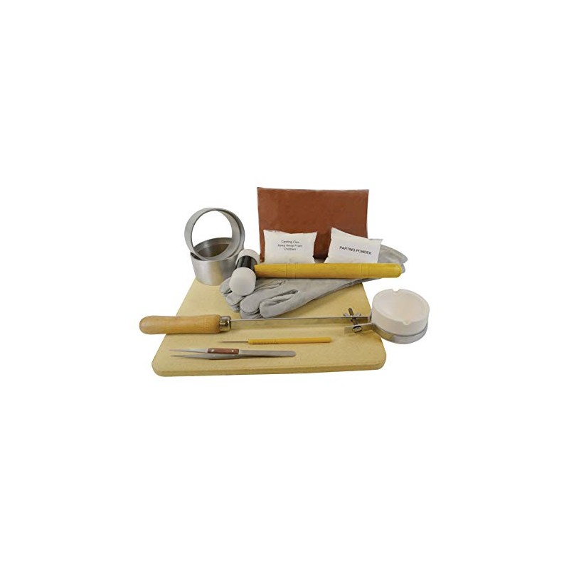 This deluxe kit includes the following products: 5 lbs of sand, a high heat-resistant board, one pair of 13" long cowhide heat-resistant gloves, 4 ounces of parting powder, a nylon hammer, (2) 100 mm aluminum ring molds, adjustable fly-nut tongs, fiber-grip tweezers, tungsten soldering pick, a 3" in diameter ceramic crucible, and a 4 ounces of anhydrous casting flux.
