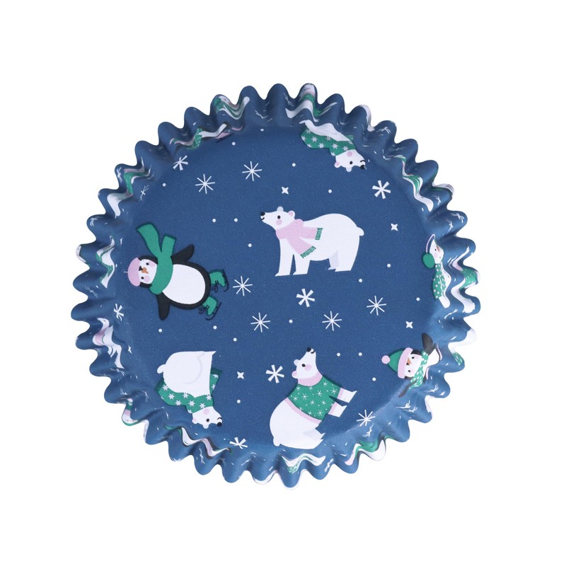 - Pack of 60 cupcake wrappers. Includes 2 designs, 30 baking cups per design, with a blue motif of snowmen, penguins and snowflakes.
