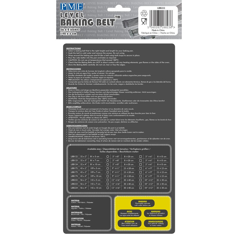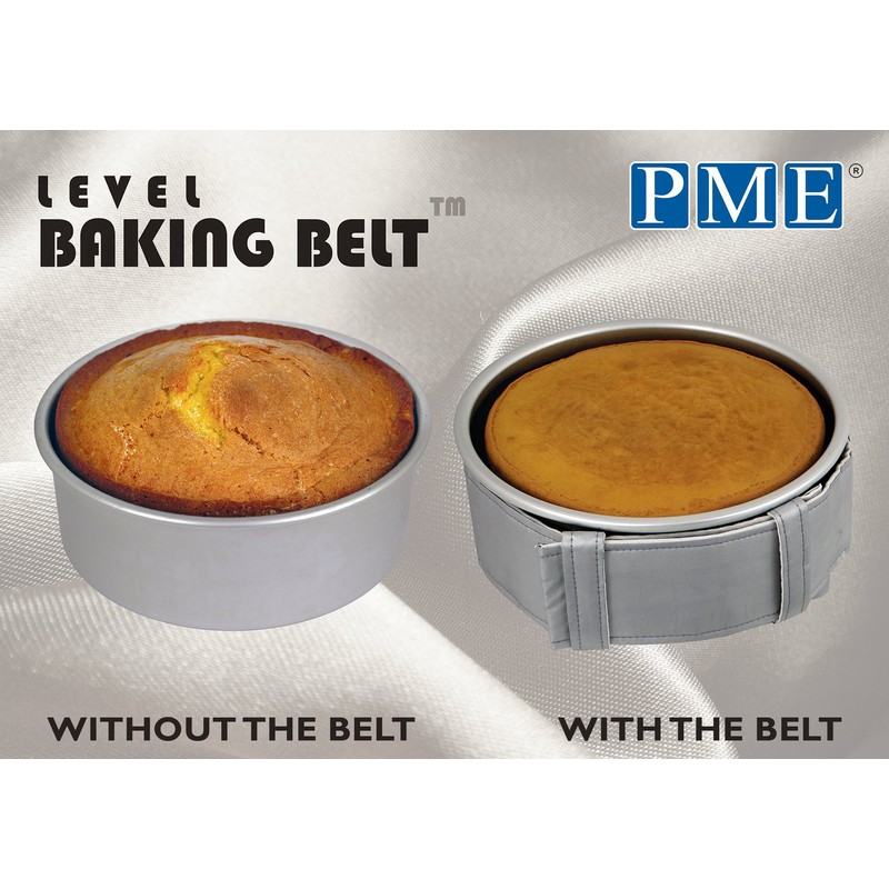 Bake perfectly Level Moist cakes without any cracks simply by using a Level Baking Belt. Baking a cake should be fun and rewarding but unfortunately on many occasions we may feel disappointed with the results, especially when the cake has risen in the center or baked with deep cracks on the top. Problems that can create wasted cake and ingredients, along with the frustration and stress of having to re-bake or change the cake design to overcome the problems. The PME Level Baking Belts come in 9 different sizes to give the optimum fitting to any shape cake tin you own. They are quick to assemble with pin-free fastening and provide outstanding results. They work by insulating and reflecting heat coming to the pan from the sides, forcing it instead to rise evenly from base of the tin upwards.