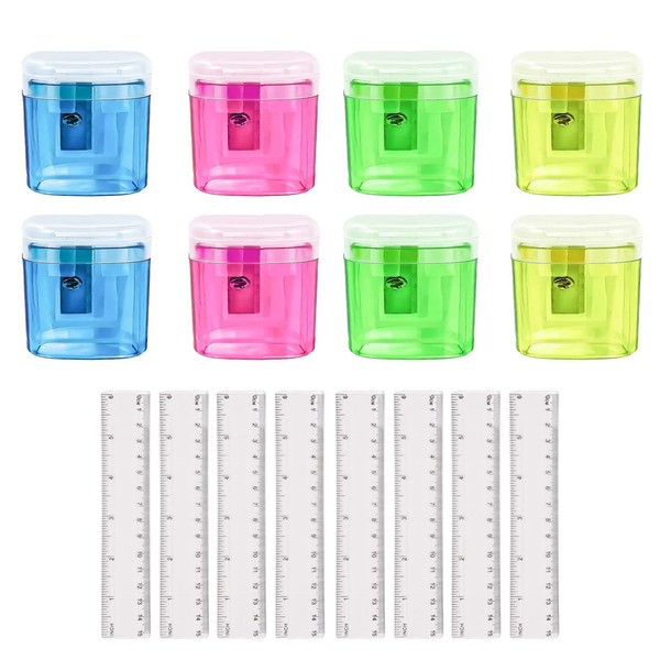 Contents: the sharpener is available in four different colours, there are 2 for each colour, for a total of 8 to meet your daily needs. 8 clear plastic rulers with inches and centimeters scale of 6 inches / 15 cm.