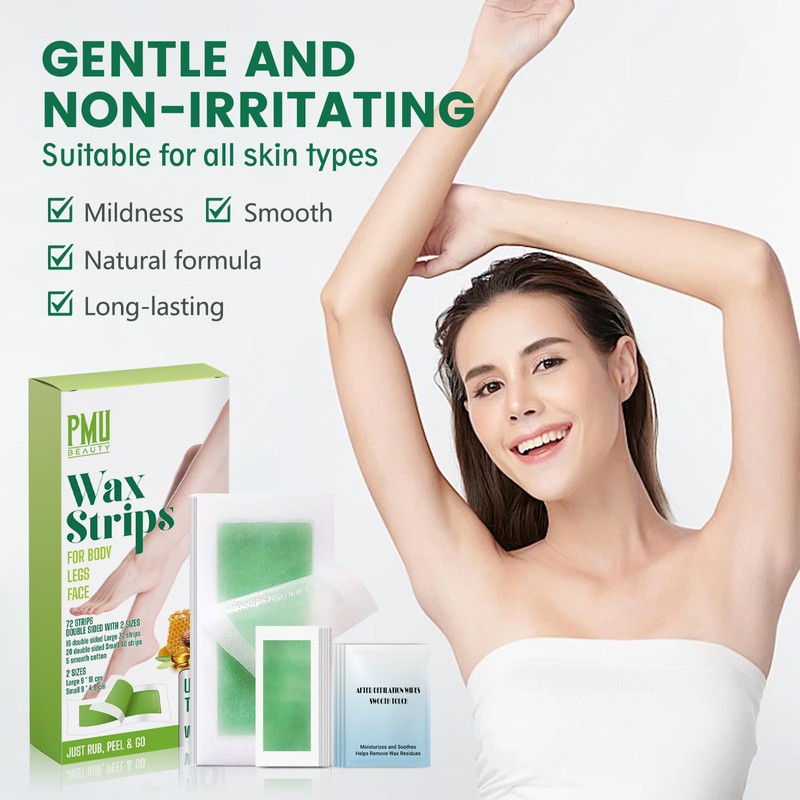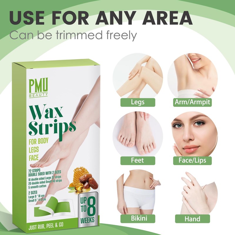 PMUBEAUTY Wax Strips 72 Counts 32 Body Wax Strips 40 Face Wax Strips for Hair Removal Double Sided Waxing Strips for Bikini & Brazilian, Waxing Face, Legs, Arms, Chest (2 Sizes, 5 Calming Oil Wipes)