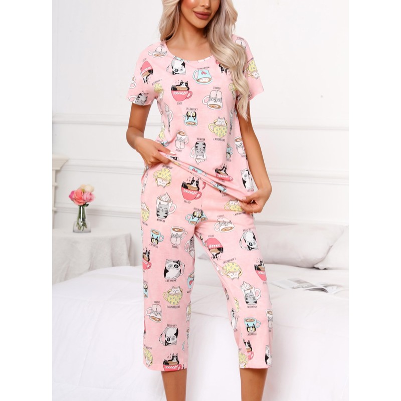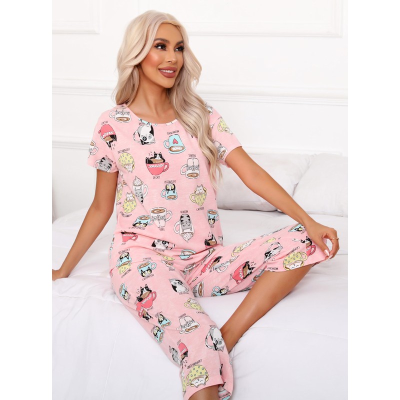 PNAEONG Women’s Pajama Set - Sleepwear Tops with Capri Pants Casual and Fun Prints Pajama Sets SY215-Cup Cats-2XL