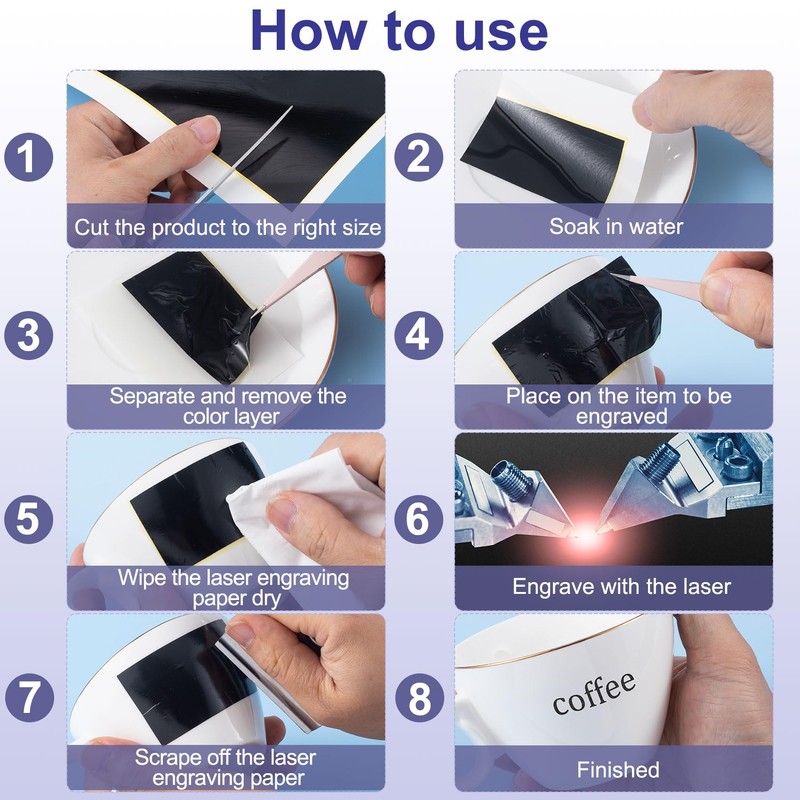 - How to Use: Firstly, cut the laser engraved black papers into the appropriate size. Then soak the paper for 1-2 minutes. Next, place the paper onto the item and wipe dry with a tissue. Then, use a laser machine for carving. Finally, scrape off any excess laser paper, and the pattern will remain on the surface.