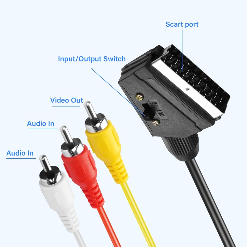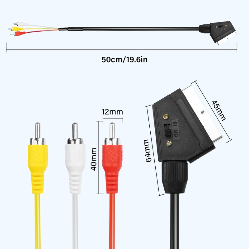 - Connector A: SCART Male; Connector B: Red, White and Yellow 3RCA Male Cable length: 0.5 m / 1.6 ft