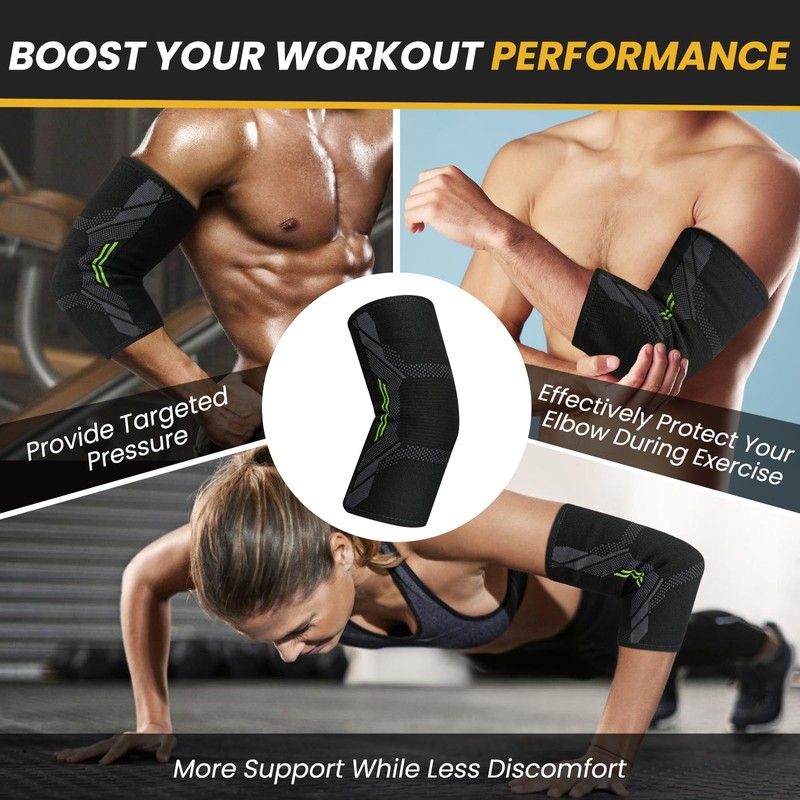 - Special cushioning track: the arm guard is chic looking and covers the contours of your elbow; These elbow bracers are designed to provide elbow support for all fitness levels; Four support lines that can stabilize both sides to keep the elbow quite warm.