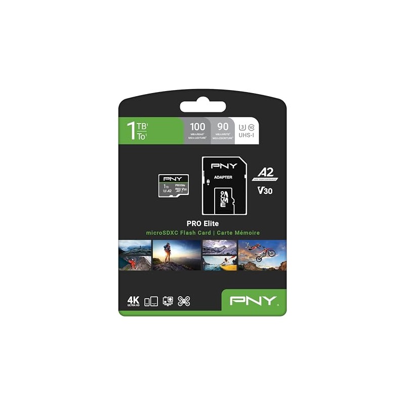 PNY 1TB PRO Elite Class 10 U3 V30 microSDXC Flash Memory Card - 100MB/s, Class 10, U3, V30, A2, 4K UHD, Full HD, UHS-I, Micro SD