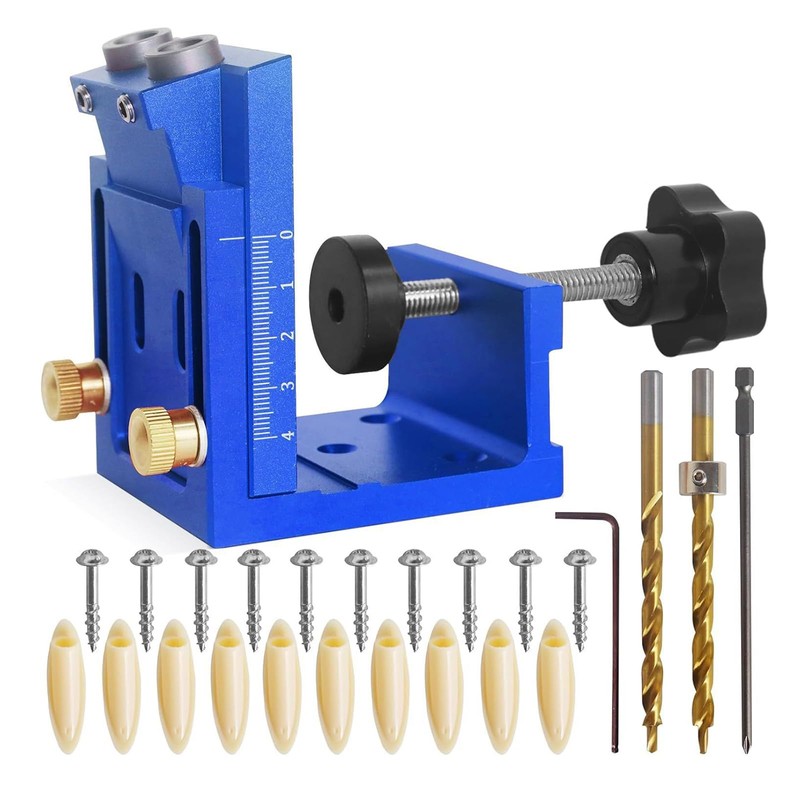 - Complete Kit, Ready to Use: The pocket hole jig kit includes: 1 jig, 2 titanium HSS drill bits (9.5mm), boundary ring, cross drill bit, 10 blockers, 10 pocket hole screws, and a manual. Accelerate your projects with this all-in-one set—backed by dedicated customer support.