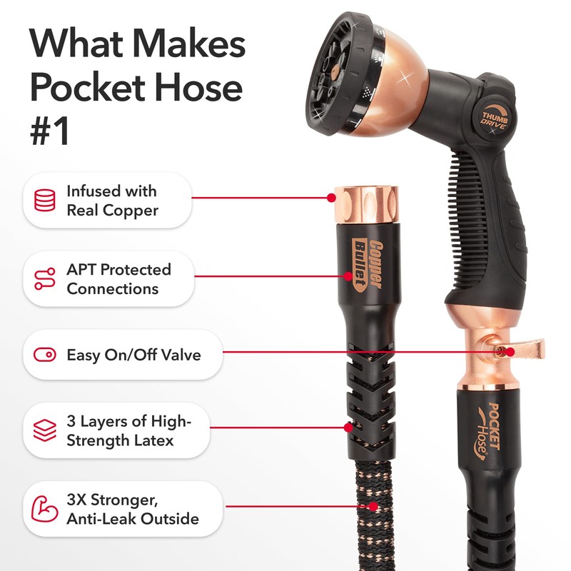 Pocket Hose Copper Bullet Expandable Garden Hose 25 FT w/10 Pattern Thumb Spray Nozzle AS-SEEN-ON-TV 650psi 3/4 in Patented Lead-Free Ultra-Lightweight Solid Copper Anodized Aluminum Fittings No-Kink