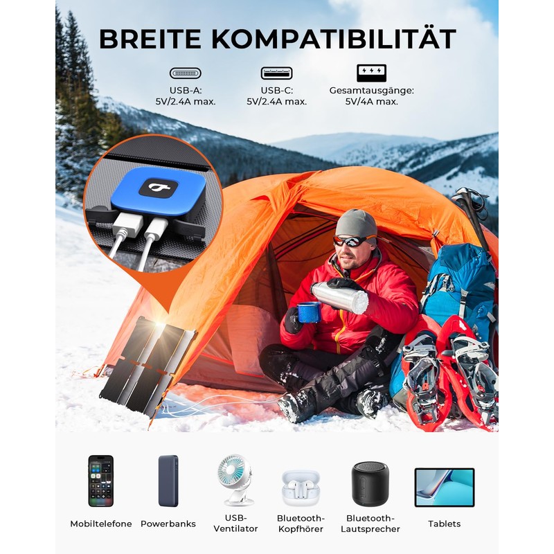 - [Efficient and Intelligent Charging] With USB-A and USB-C ports, this solar charger can power two devices at the same time. This saves time and ensures that your devices stay ready for use as long as there is enough sunlight