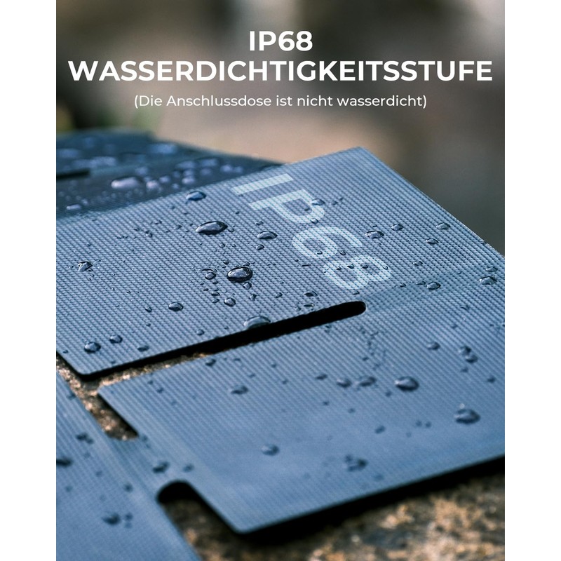 - IP68 water and dust resistance: This portable solar panel is IP68 certified and can withstand splashes, spills and light rain. The integrated intelligent charging technology optimises the power supply and ensures 100% safe charging of your devices