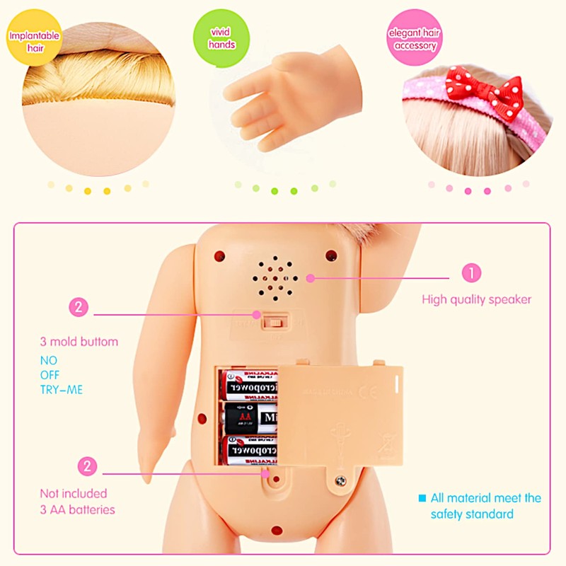 - Doll will sing, talk and walk when you clap hands twice, or press her chest