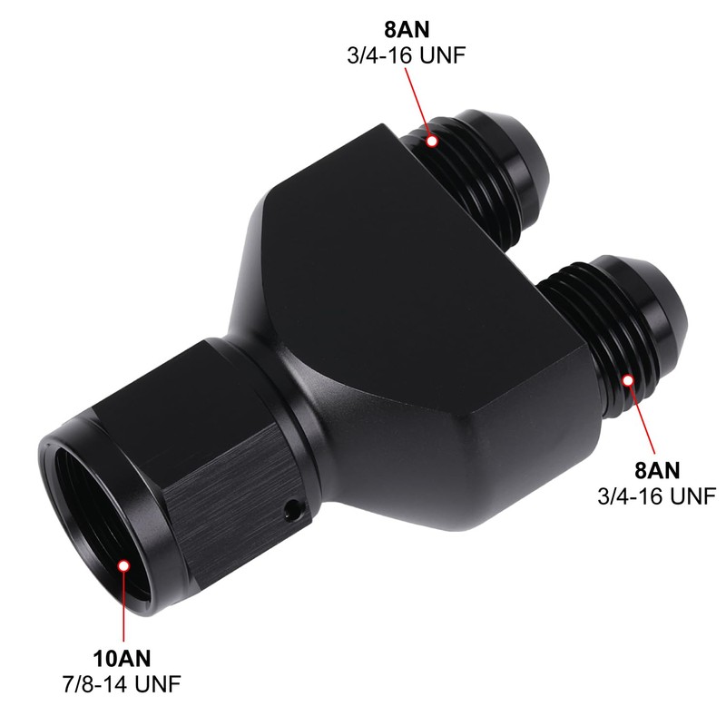 - AN10 (7/8-14 UNF) hembra a paralelo 2 x AN8 (3/4-16 UNF) divisor de combustible de bloque Y macho