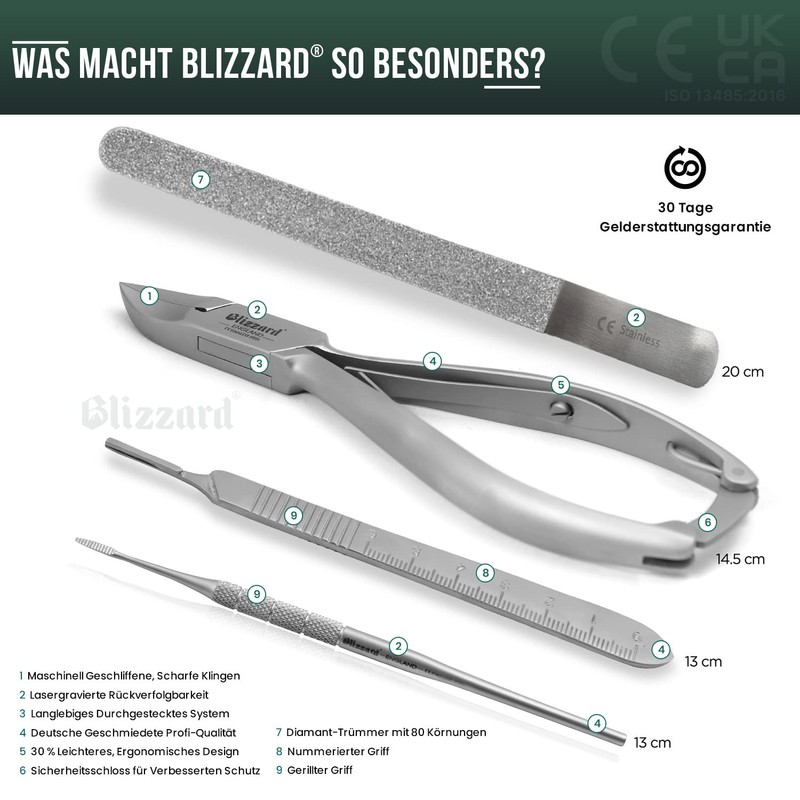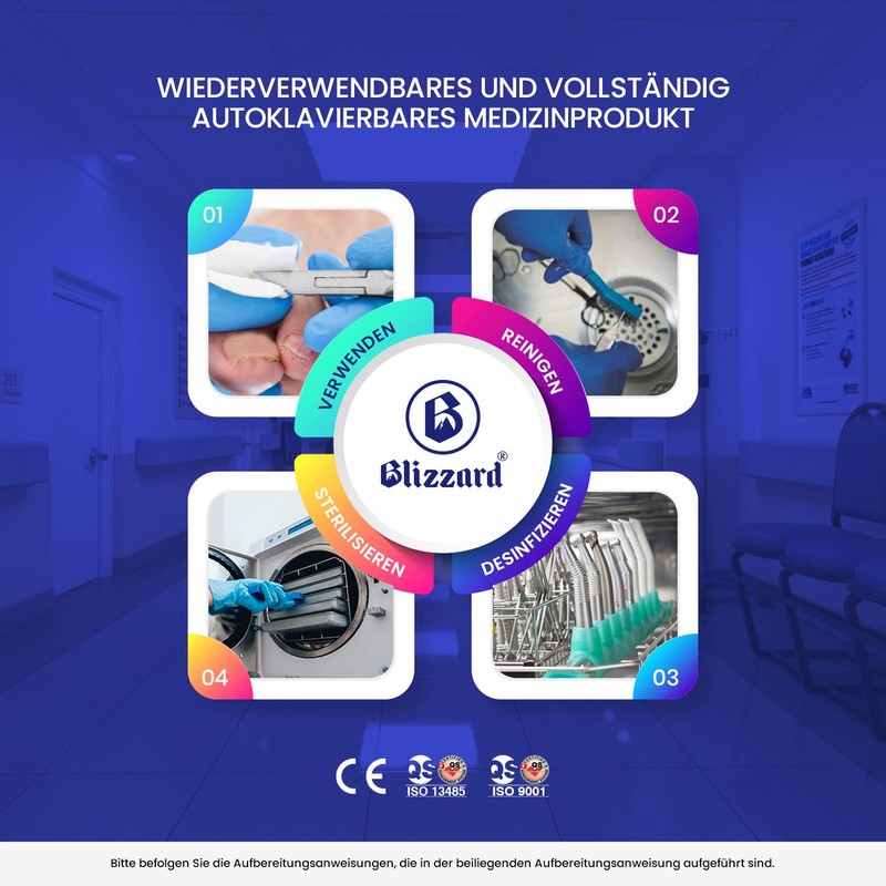 - Hospital Grade Medical Device: Blizzard reusable, fully autoclavable podiatry instrument set is built from premium German steel to the highest quality standards ISO 13485, ISO 9001 and CE certified.