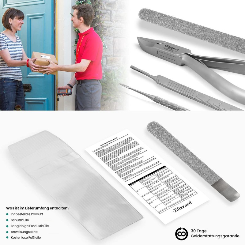 - Satisfaction Guarantee: Blizzard podiatry instruments set is backed by manufacturer's 30-day money-back guarantee. Delivered package includes safety caps, durable plastic sleeves and complimentary foot file.
