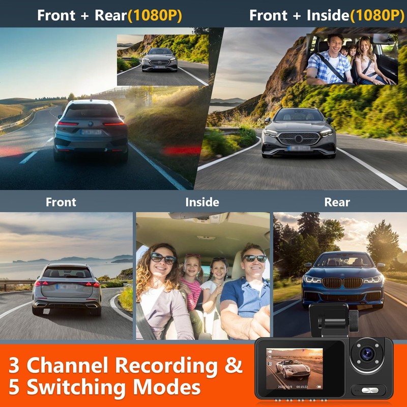 - 【3 Channel Dash Cam】The dash cam is equipped with the front, inside, and rear cameras to record clear driving details simultaneously at 1920*1080P/ 640*480P resolutions.HDR tech for all 3 channel cameras to balanced exposure and dashcam wide angle cameras to capture more road details, making camera to be a ideal choice to record beauty of your journey. allowing simultaneous monitoring of your car's front, interior, and rear, providing valuable evidence for insurance claims and disputes