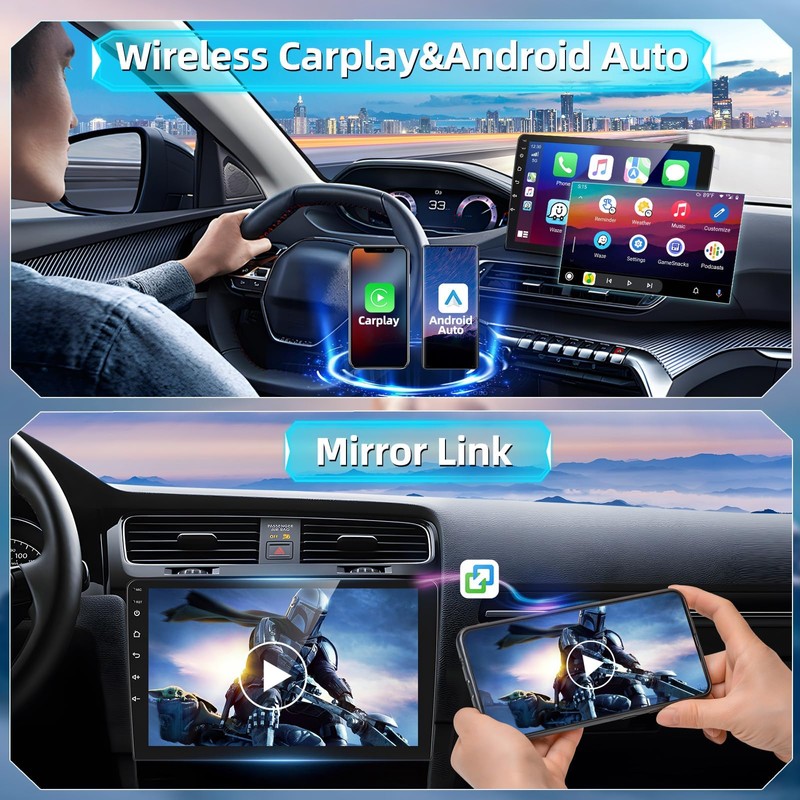 • 【Wireless Carplay】Seamlessly connect your mobile phone to access a wide range of features including the address book, mail, notifications, map navigation, music, videos, and more. With the Wireless Carplay, you can easily control these functions using voice commands, making your driving experience safer and more convenient. Whether you prefer the convenience of wireless connectivity or the reliability of a wired connection, our system offers the flexibility you need!